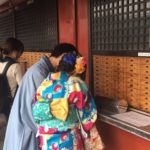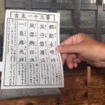 Wir haben unser Orakel getestet, die hundert Yen bezahlt, dann die Büchse mit den Stäbchen geschüttelt, eines aus dem Loch gezogen, die Nummer gemerkt und dann die entsprechende Schublade gesucht (dauerte mit den Schriftzeichen etwas länger) und anschliessend das Orakelblatt aus der Schublade genommen, gelesen (Text war auch auf Englisch) und den Zettel gefaltet, auf der Abflugrampe befestigt, damit der Wind unsere Gedanken und Wünsche zum Himmel tragen möge.