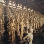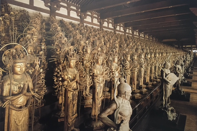 Die “Tausendhändige Kannon” , die von 1000 kleineren Kannonstatuen, die im 12. und 13. Jahrhundert aus japanischem Zypressenholz gefertigt wurden, flankiert ist, sieht schon gewaltig aus. Fotografieren war strikte verboten, aber das Kaufen von Broschüren mit den Abbildungen nicht. Wir haben eine gekauft und das Foto stammt von dort.